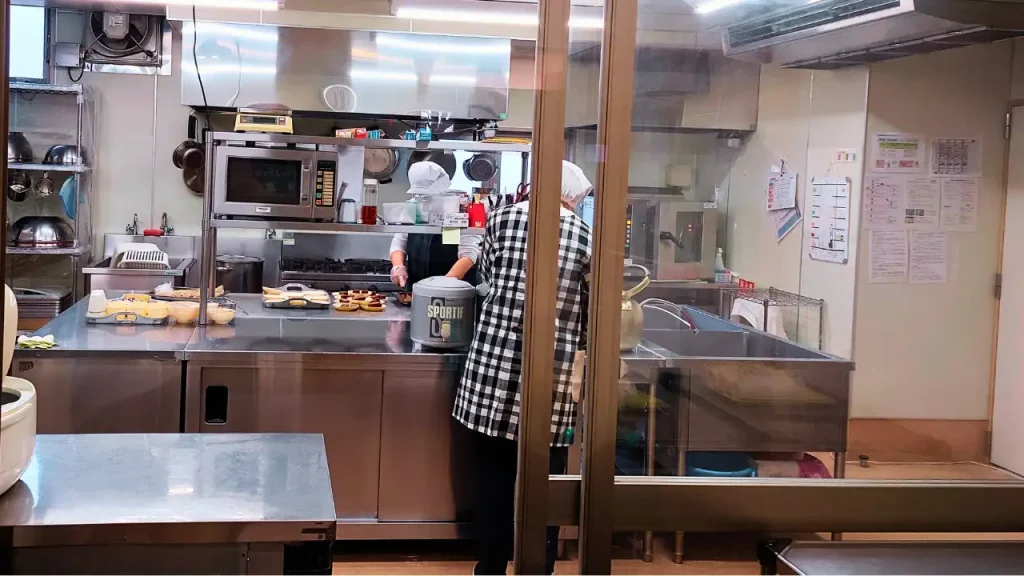 午後2時はちょうどお昼寝時間。教室をのぞくと保育士たちが、園児の背中を優しくさすりながら見守っていました。玄関を入ってすぐ目の前に給食の展示がされていて、その横の調理室では、調理師たちがおやつの用意をしていました。