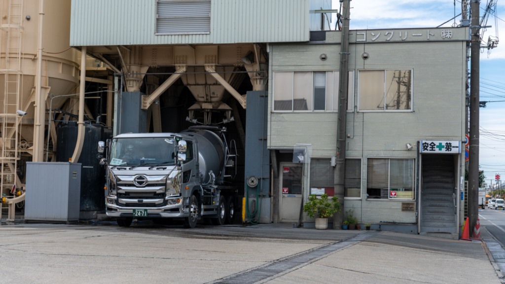 取材に伺ったのは平日の昼頃。工場駐車場に常に数台のミキサー車が待機し、生コンが充填された車が数分おきに走り出していきました。荷台のドラムを回転させて品質が保たれたまま工事現場へ。その平均運搬時間は40分~60分だそうです。