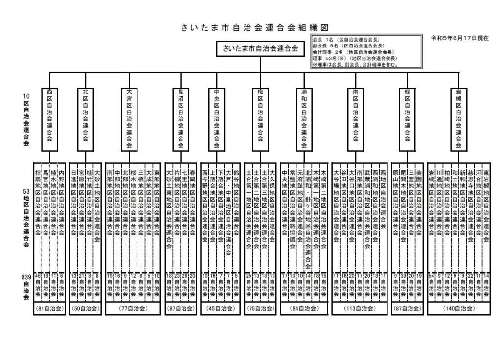 さらに、全体を統括する上部組織として「さいたま市自治会連合会」(以下:連合会)があります。